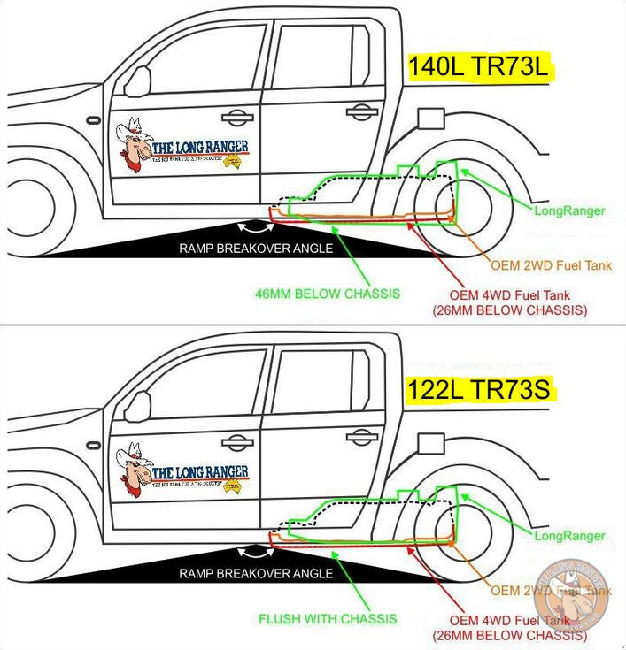 LongRanger-Tanks sind einfach zu montieren und wurden für maximale Bodenfreiheit und kompromisslose Abfahrtswinkel des Fahrzeugs entwickelt. Hergestellt aus 2 mm aluminisiertem Stahl für Stärke und Haltbarkeit.